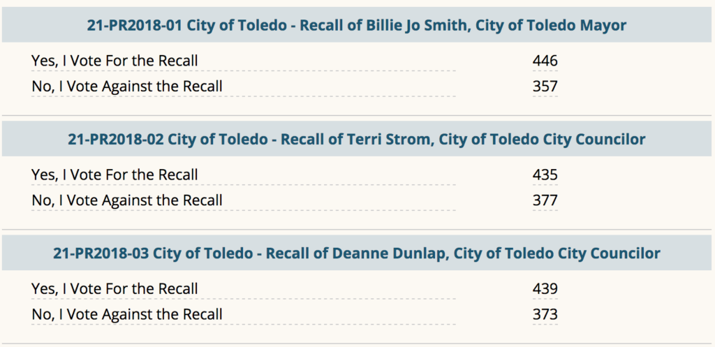 It was a close vote on all three re-called members of the Toledo City Council. Mayor Billie Jo Smith and City Councilors Terri Strom and Deanne Dunlap. Charges flew back and forth between former city employees and the three on the council, former employees claiming inappropriate behavior on the part of the councilors while the councilors claimed they relied on the city manager and auditors as to what is legal and what isn’t. Most of it centered around the city budget and the way it was dealt with on both sides.