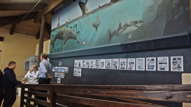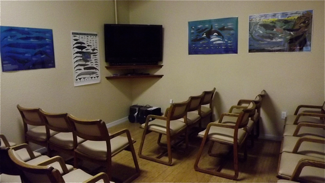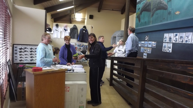 Owner Carrie Newell, caught in photo #4 (in black) smiling at the camera, said it was an outgrowth of her successful whale watching business which always produces more customer questions about the sea than she has the opportunity to answer. So, the museum is her way of answering those questions. Visitors can wander about, drinking in the sights and ambiance of the ocean, which in one case emanate from a flat screen in the museum’s Sea Life Theater. Various DVD’s are featured that cover specific aspects of the open sea. Some are even for sale along with informational books Carrie has authored about whales, dolphins, porpoises, seals, sea lions, sea otters, seabirds and shorebirds.
