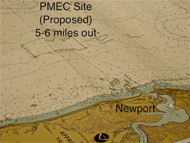 The Newport group was presented with a proposed site south of the Newport jetties and between five and six miles offshore. The area is said to be ideally suited for testing under conditions sought by wave energy device designers; having a sandy bottom and between 100 and 150 feet deep. The area is also well situated for routing power cables from the devices to energy grid connections on shore.